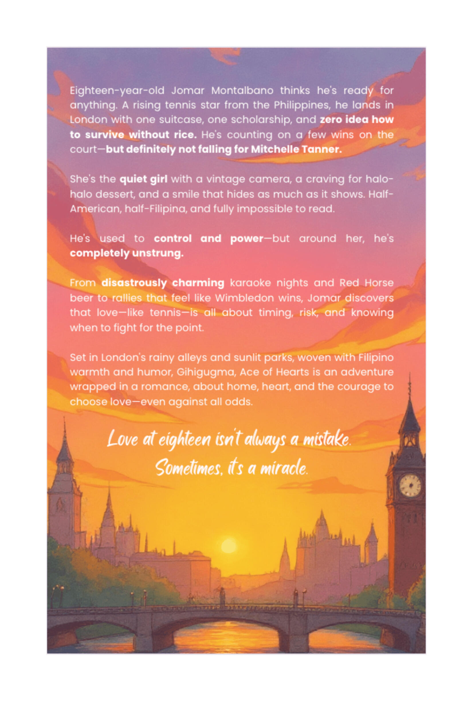 “Wow, I absolutely loved this book! That's all I did all afternoon! I’m amazed by how perfectly you describe Filipino food (have you tried it all?), how you write tennis like a pro, and how you bring London’s sights to life (I know them all!). This will completely click with readers everywhere!”“A fabulous romance that captures all the delicious tension of young love! From the heart-fluttering uncertainty of first texts to those vulnerable first touches, this story perfectly evokes the magic and mishaps of new relationships. The richly drawn tennis backdrop and mouthwatering Filipino food descriptions add irresistible flavor, while the international setting brings authentic travel challenges to life. With its will-they-won’t-they spark and gorgeous prose (‘She whispers as if letting a secret slip out in the dark’), this is a love story that will resonate with anyone who remembers—or is experiencing—their first breathtaking romance. Brava!”